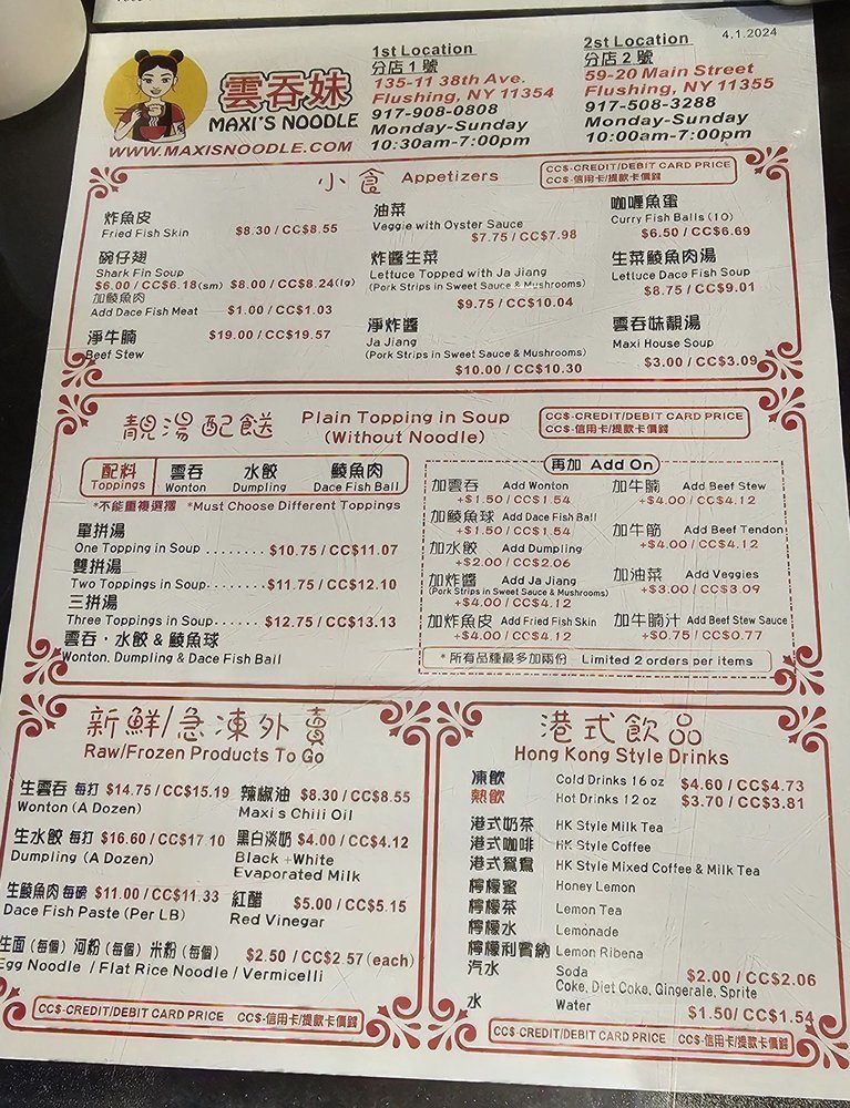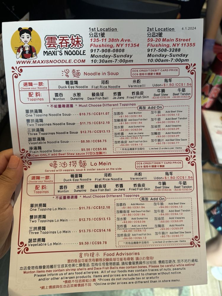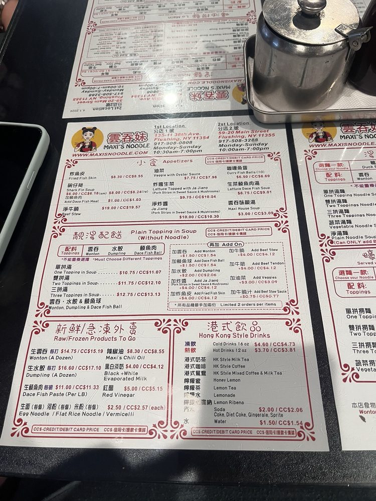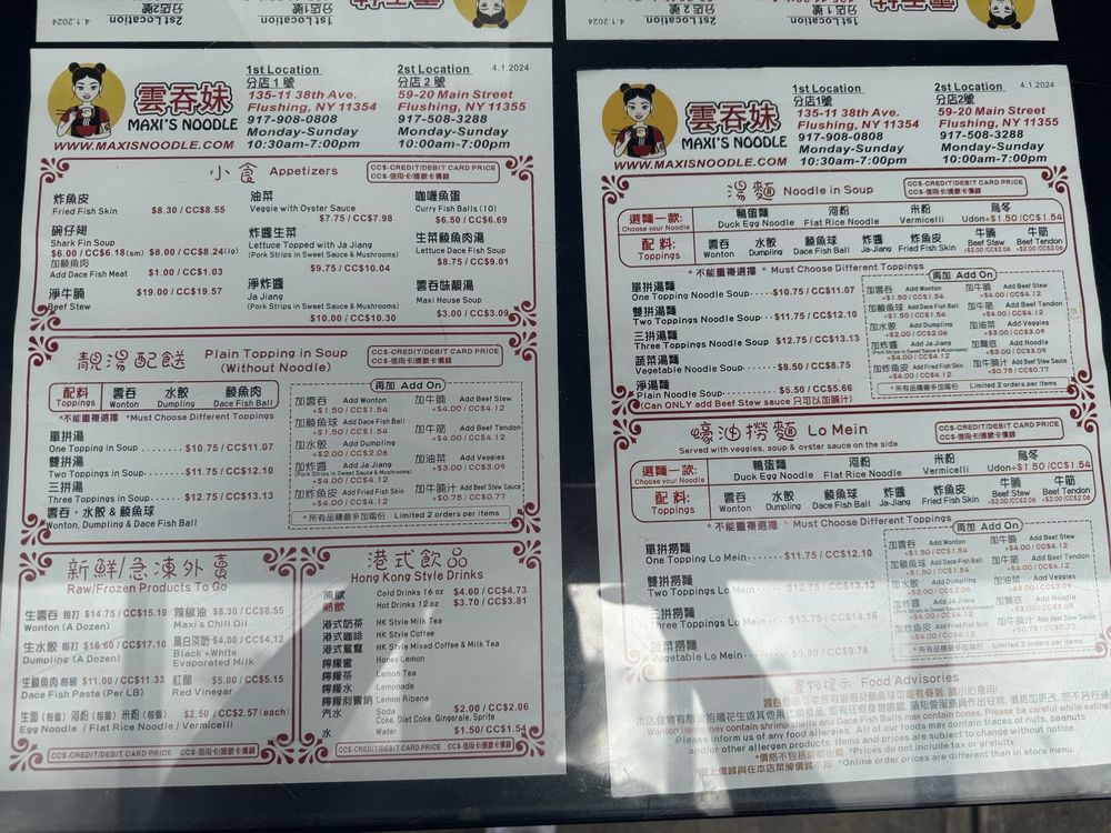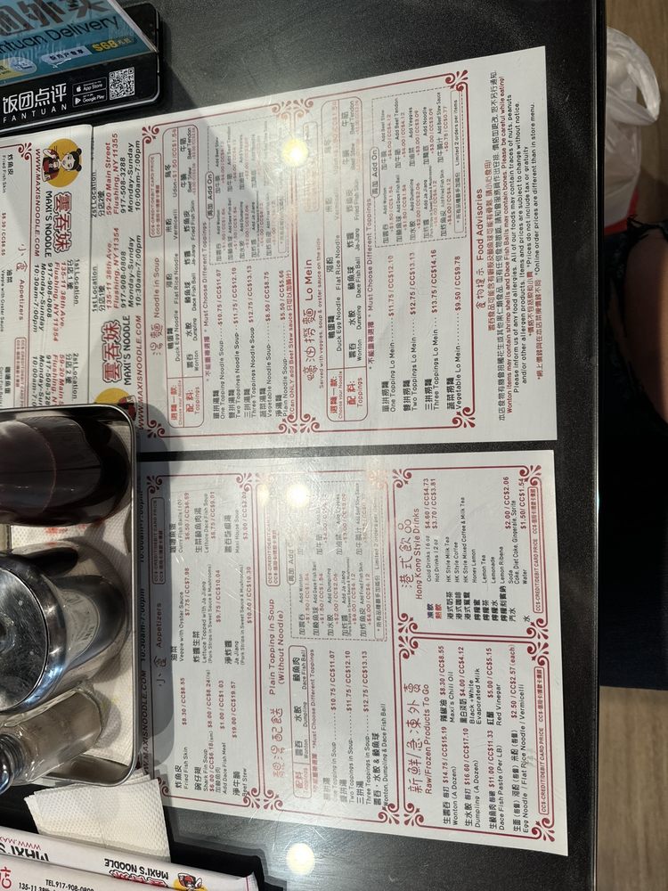 Maxi’s Noodle is a hidden gem in Flushing, NY known for its authentic and flavorful noodle dishes. This Asian-owned restaurant offers a variety of menu options, including vegetarian choices, making it a versatile dining spot for all. The highlight of the menu is the shrimp wonton noodle soup, filled with generously stuffed wontons and savory broth. Customers rave about the beef stew and crispy fish skin appetizers, showcasing the diversity of flavors available. The cozy atmosphere and attentive service make dining at Maxi’s Noodle a delightful experience. Don't miss out on trying their Hong Kong style coffee and lemon tea for a refreshing beverage pairing. Whether you're looking for a quick lunch or a relaxing dinner, Maxi’s Noodle is a must-visit spot for delicious Asian cuisine.