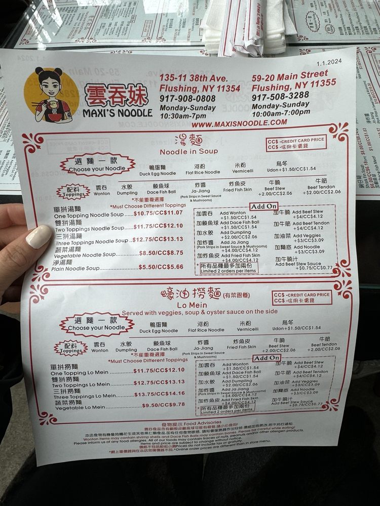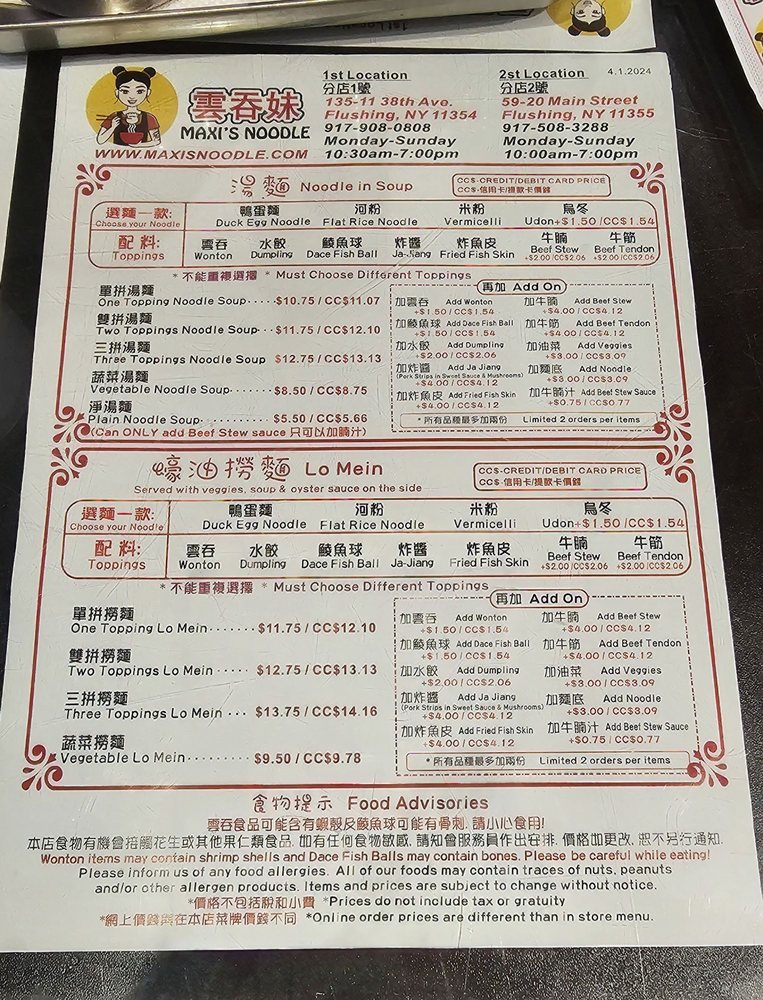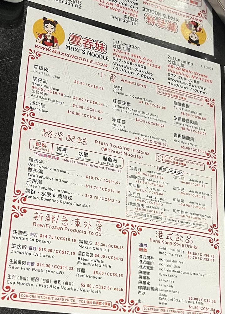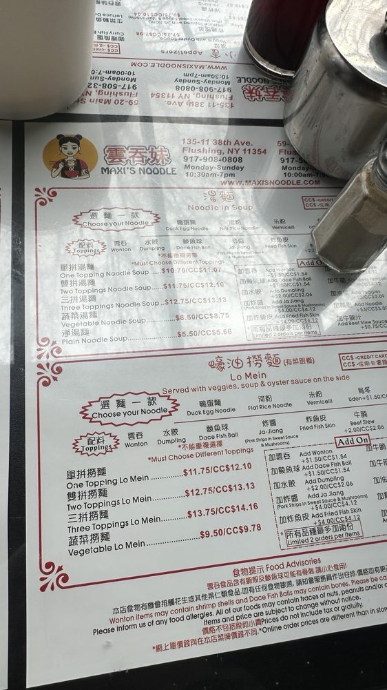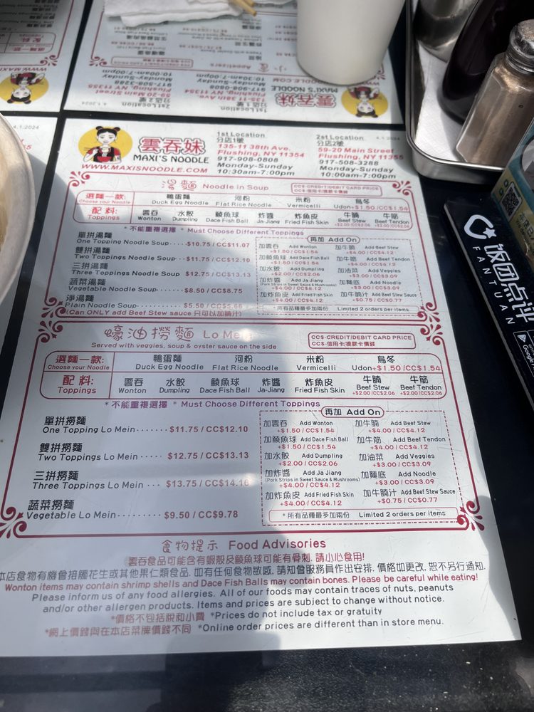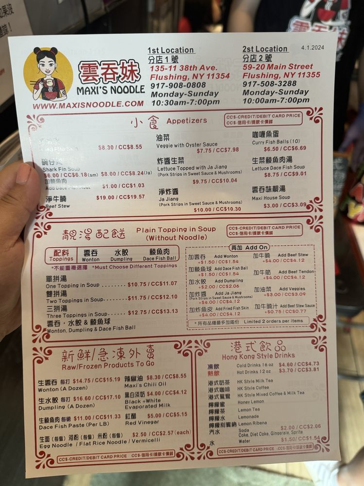 Maxi’s Noodle is a hidden gem in Flushing, NY known for its authentic and flavorful noodle dishes. This Asian-owned restaurant offers a variety of menu options, including vegetarian choices, making it a versatile dining spot for all. The highlight of the menu is the shrimp wonton noodle soup, filled with generously stuffed wontons and savory broth. Customers rave about the beef stew and crispy fish skin appetizers, showcasing the diversity of flavors available. The cozy atmosphere and attentive service make dining at Maxi’s Noodle a delightful experience. Don't miss out on trying their Hong Kong style coffee and lemon tea for a refreshing beverage pairing. Whether you're looking for a quick lunch or a relaxing dinner, Maxi’s Noodle is a must-visit spot for delicious Asian cuisine.